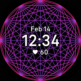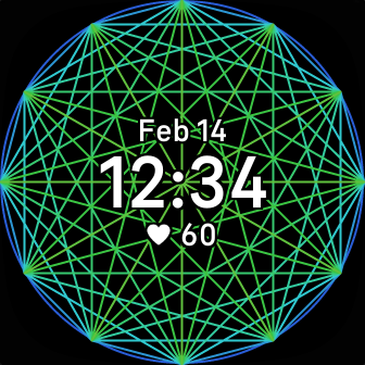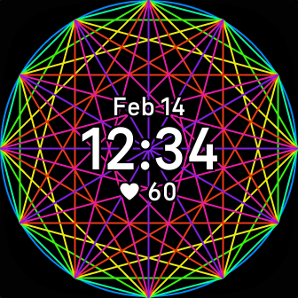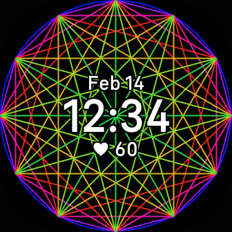 A fidget clockface. The colours change every time you tap the screen. The pattern is called a Mystic Rose.