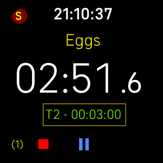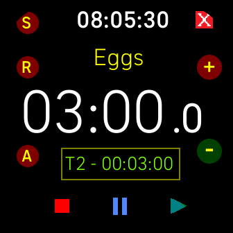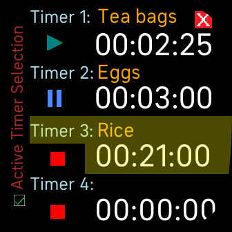 Four Countdown Timers, each with individual labels & settings remembered between sessions. The multiple timers can run concurrently. Clock time shown during use, includes Stopwatch